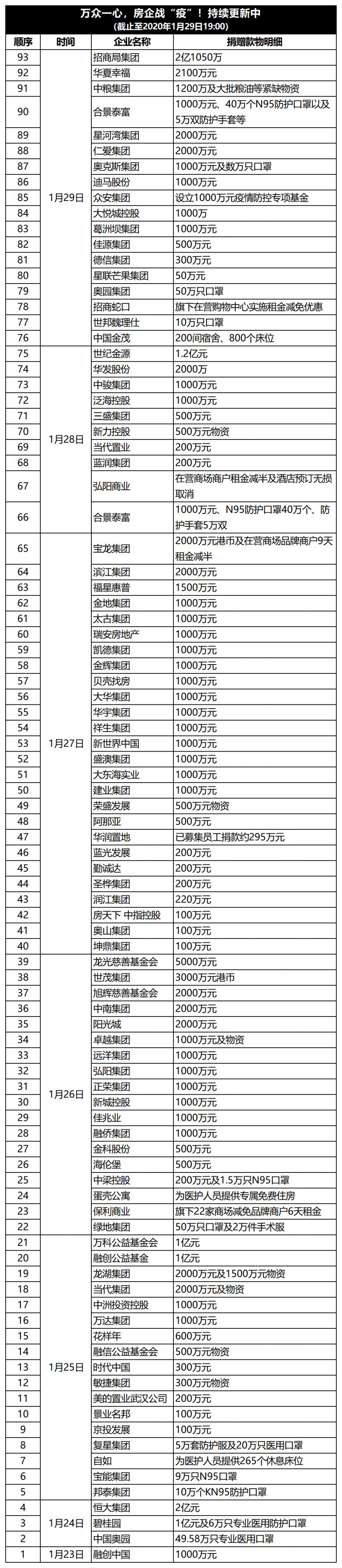 1月29日,风财讯据揭露材料收拾各企业援助情况,到现在,全国已有93家房企,捐款14.28亿元,超17家房企建立新式肺炎专项基金。(到2020年1月29日晚19时)
