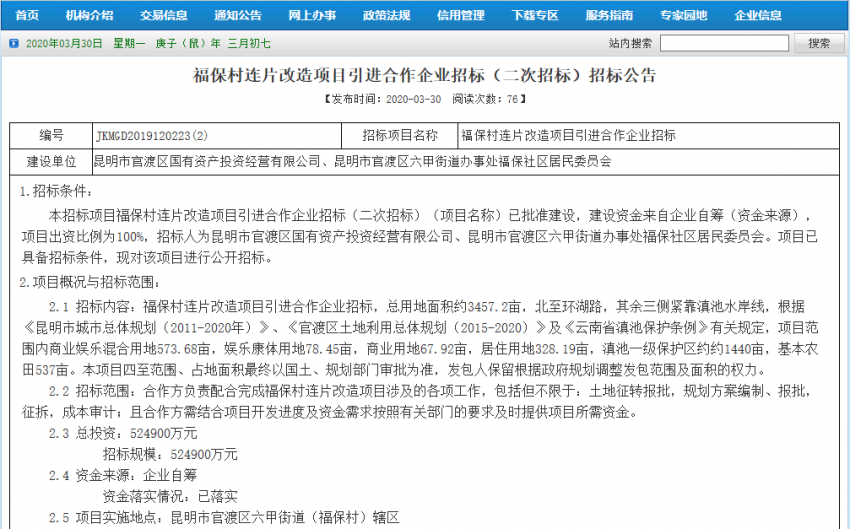 今天,昆明市公共资源交易中心发布《福保村连片改造项目引进合作企业投标布告(二次投标)》,依据布告,旧日的“云南第一村”将再次引进合作企业进行开发。