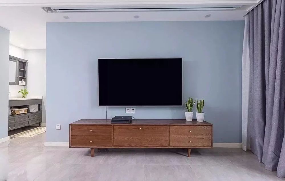 电视背景墙以淡蓝色为主,以窗布都同一色系的,不会过分艳丽。