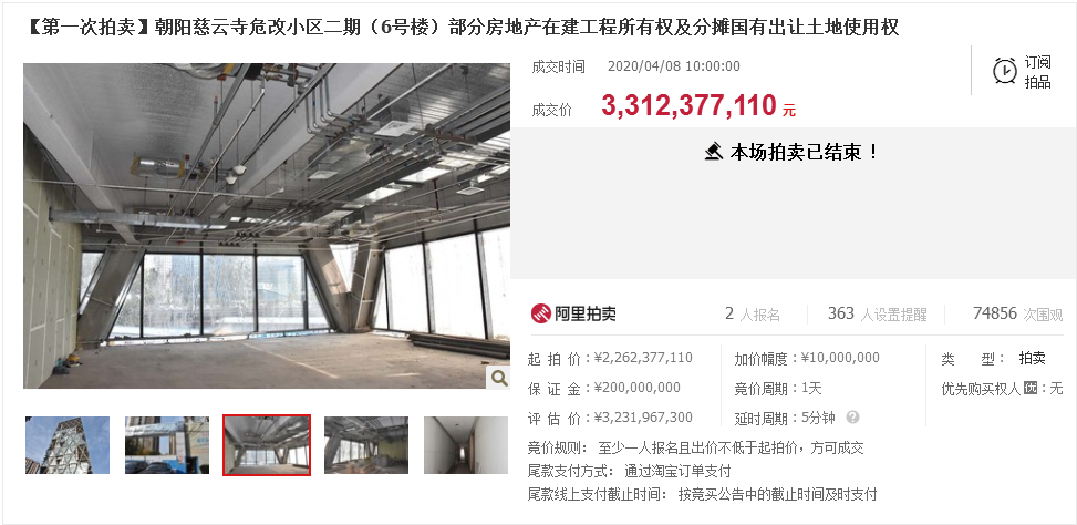4月8日,在通过15轮剧烈的竞价后,中弘大厦终究以33.12亿元被北京植晟云厦物业办理有限公司接手,溢价10.5亿元。